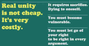 St. Augustine said: “In non-essentials, diversity. In essentials, unity. In all things, charity and love. Real unity is not cheap. It requires sacrifice, dying to oneself. It requires becoming vulnerable.